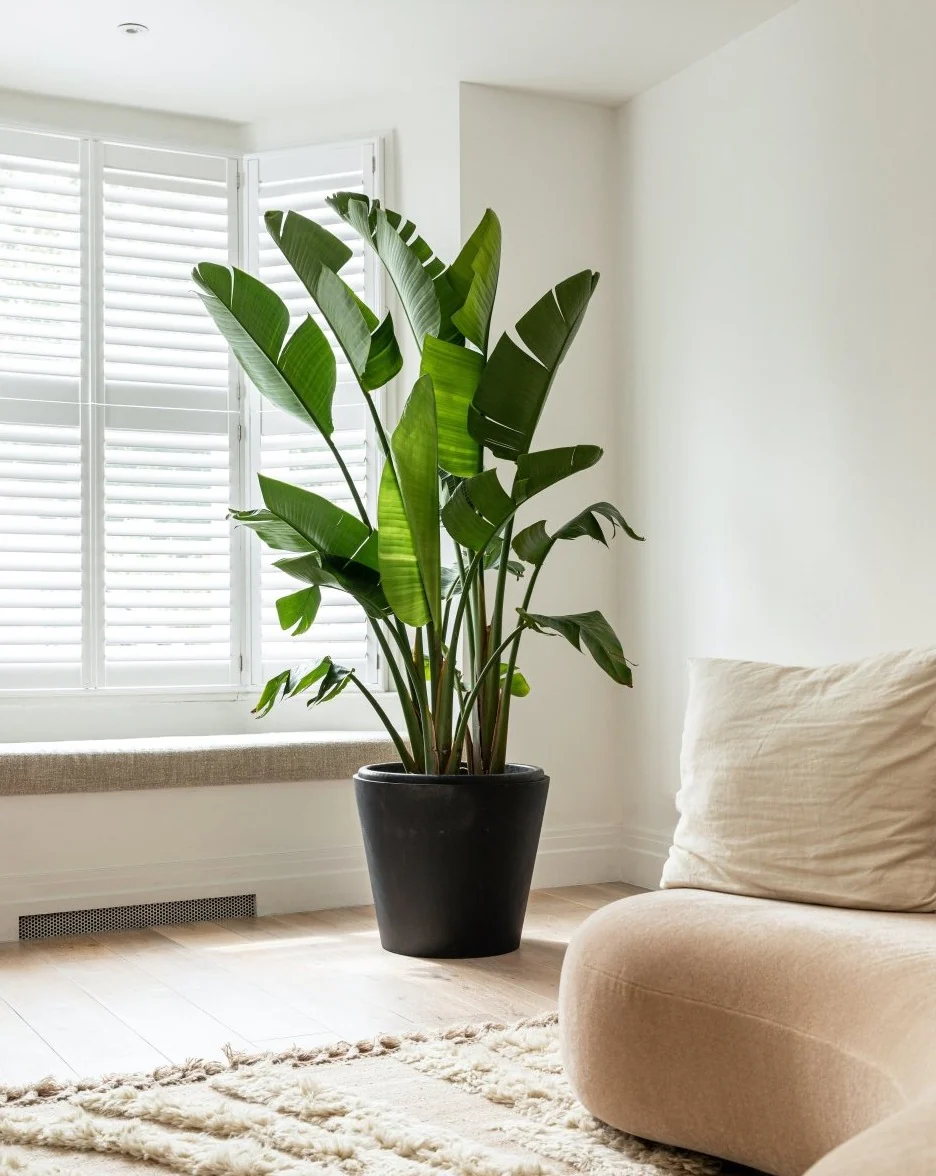 This white bird of paradise is an exquisite tropical plant with one of the most striking, grand architectural designs, characterized by big leaves. This one's a favorite of interior designers who love its dramatic, long-arching leaves to create an ultra-beautiful, tropical look. If you're looking for an indoor house plant that is both exotic and beautiful, White Birds of Paradise Strelitzia Nicolai will be perfect. This plant does best in bright, direct sunlight. Place it in a location that gets a good amount of natural light throughout the day. The White Bird of Paradise prefers temperatures above 65 degrees Fahrenheit. Bring it inside when temperatures start dipping below 50 degrees Fahrenheit. The white bird of paradise is an indoor plant in a pot that could grow to be as tall as 10-12ft. It needs its space to be expansive enough to let the plant grow to this size and spread out comfortably. Read more about the Top 8 Advantages of Having Birds of Paradise in Your House.
