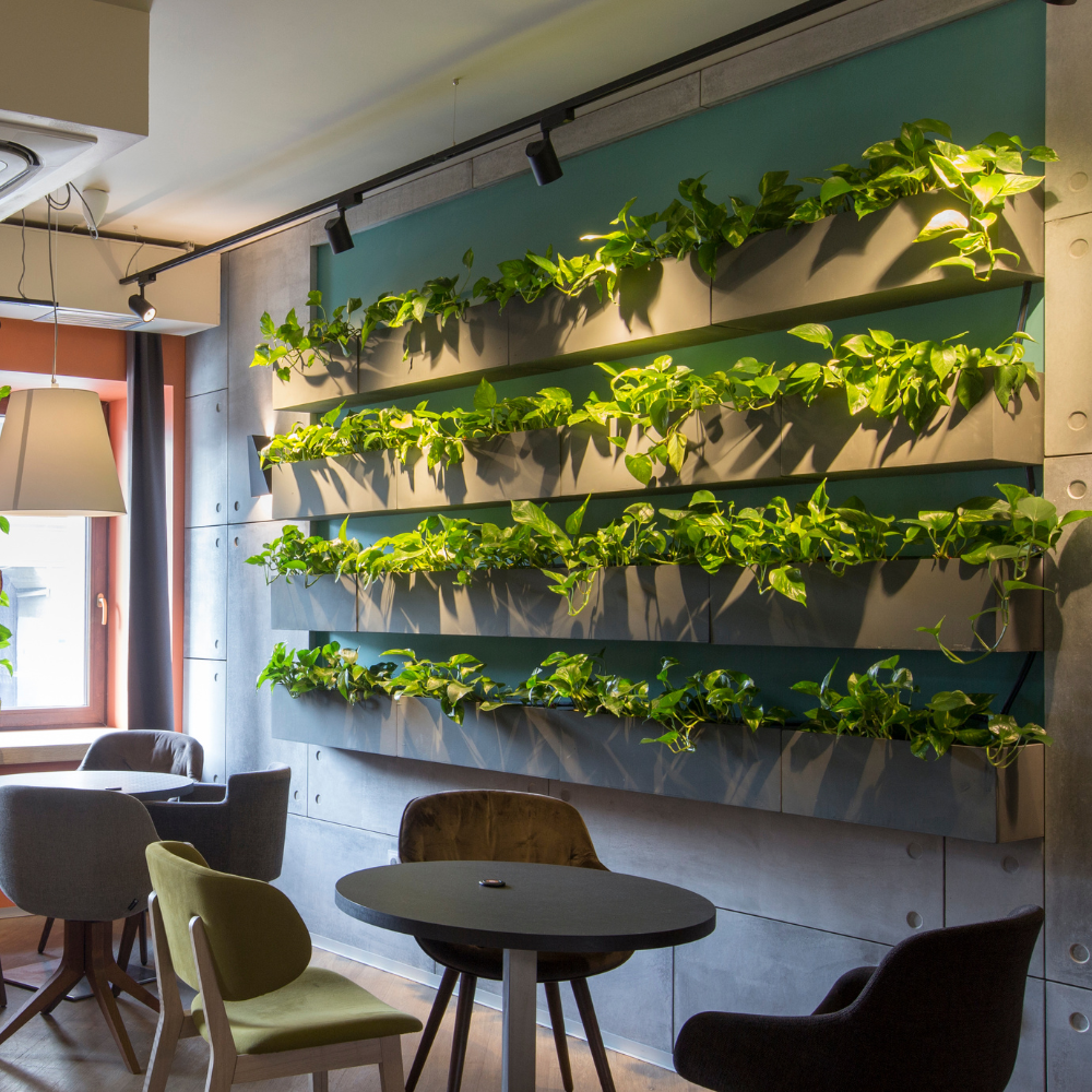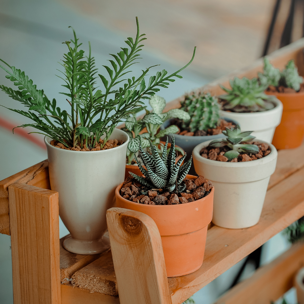 A long wooden tray filled with small potted plants like Mini Monstera, Calatheas, or Snake Plants would do nicely. You can mix textures and colors while keeping the arrangement flexible in the sense that you can change up the plants as seasons change or as you find new favorites at Eureka Farms.