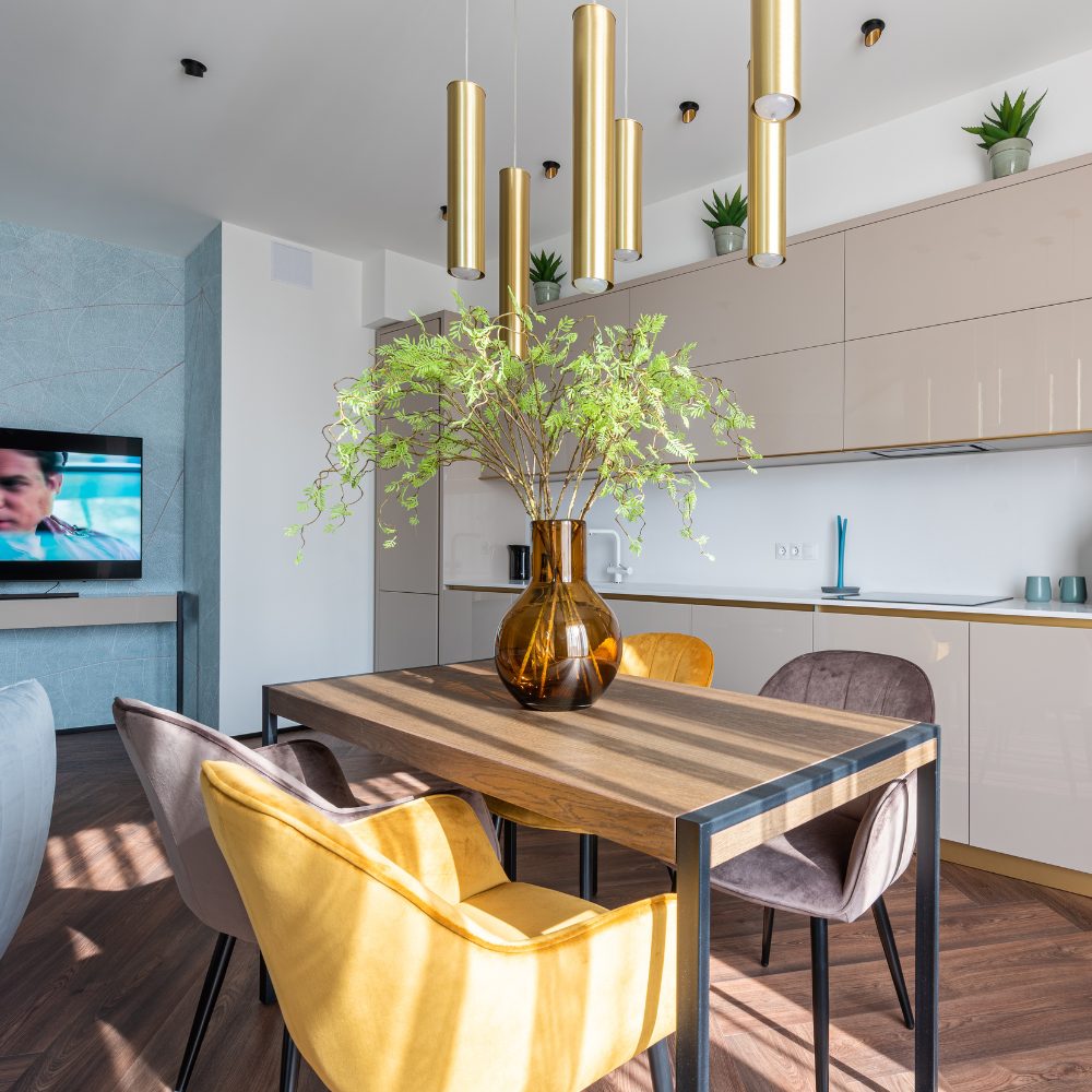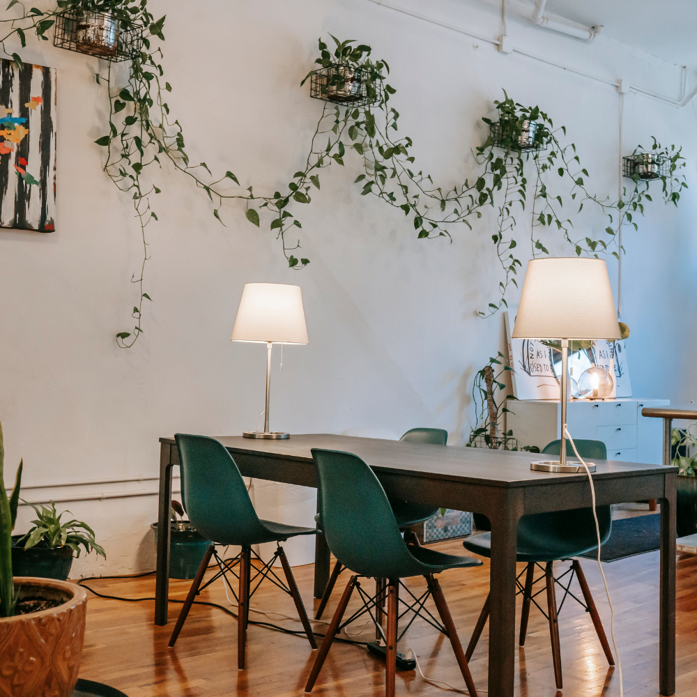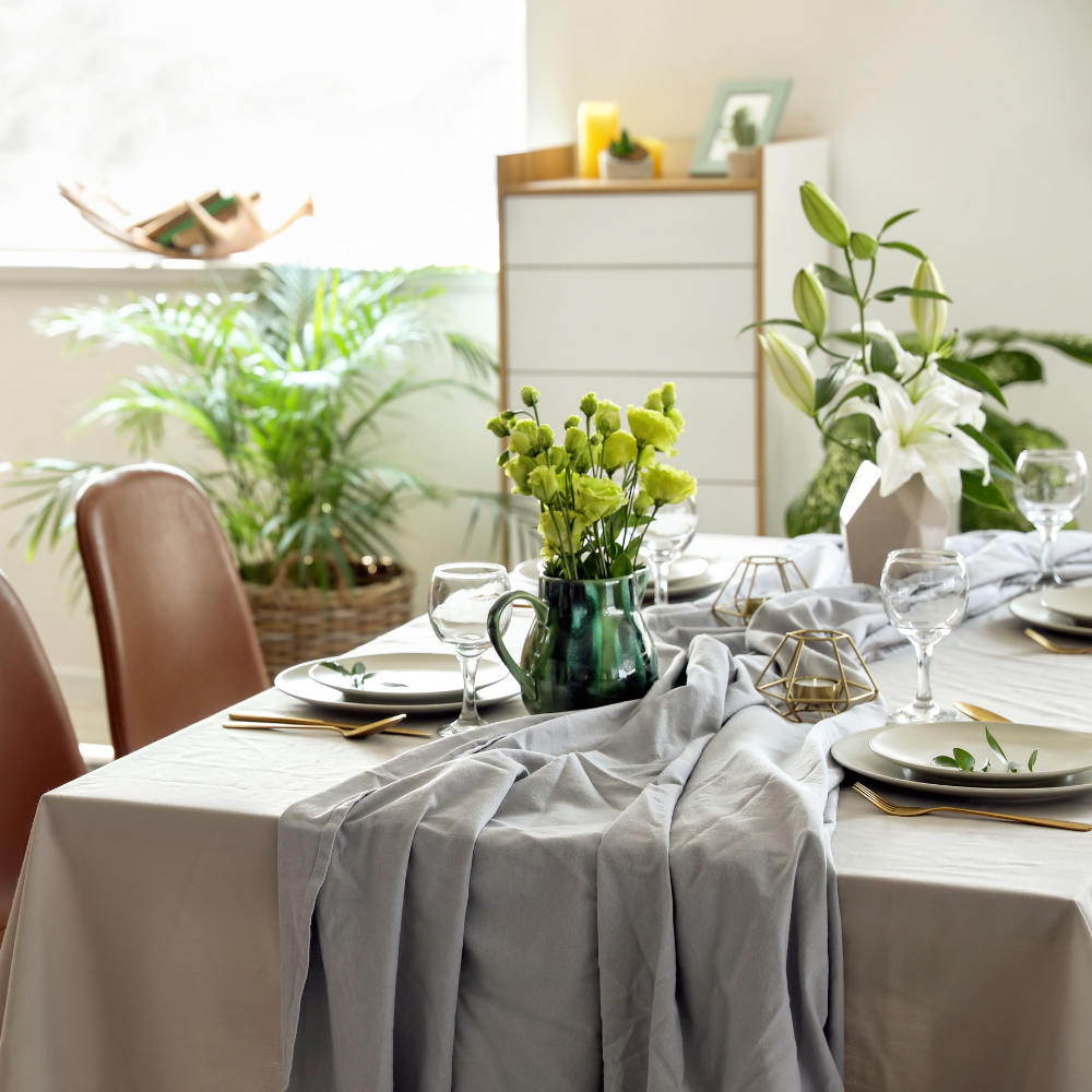 An attractive centerpiece makes your dining area. Forget flower arrangements and make a living centerpiece. For a modern and low-maintenance feel, you can use a bowl of succulents or an elegant bonsai tree. If you want something more extravagant, take a Fiddle Leaf Fig or Bird of Paradise, put it in a gorgeous ceramic pot, and plop it right in the middle of the table.