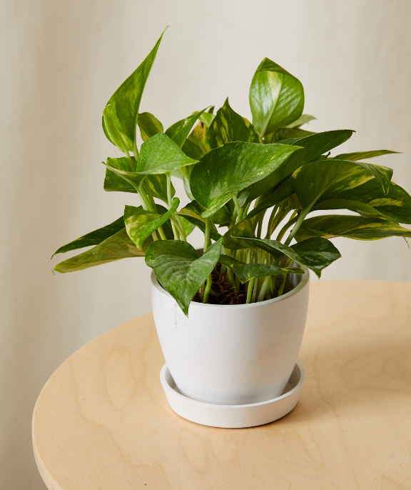 Pothos is one of the most easygoing houseplants, making it perfect for a beginner grower. The plant is a tropical vine indigenous to the Solomon Islands in the South Pacific. They can easily be trained to grow along a support stem from a pot or hanging basket. It is easy to grow and requires little attention, making it an ideal plant for every home. Pothos are very vigorous and may grow in length ranging between 12-18 inches within a month. Draping vines have sharp pointed green leaves and maybe margined with white, yellow, or pale green. It is important to know that the pothos plants are toxic to pets.Β