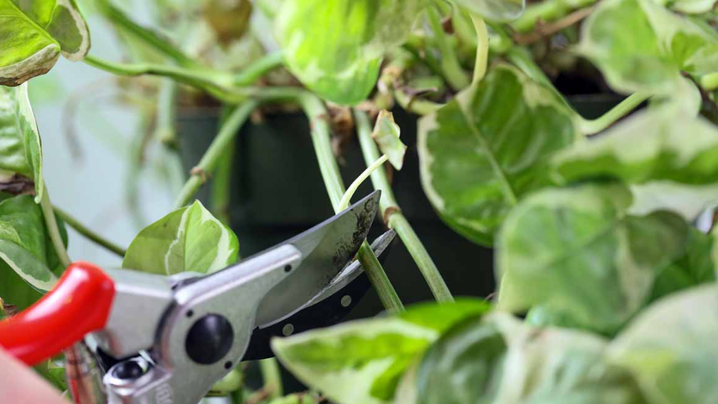Pothos can be pruned to cut out the wilted or unimpressive leaves or to make the plantβs shape more sprawling by cutting the tips of vines. To trim, take clean and sharp pruners and remove all the dead, damaged, or overgrown foliage and branches. If you are pruning in order to promote branching it is preferable to do it in the growing period, which is either spring or summer, and cut just above the node. Follow the pruning tips before you start clipping your plant.