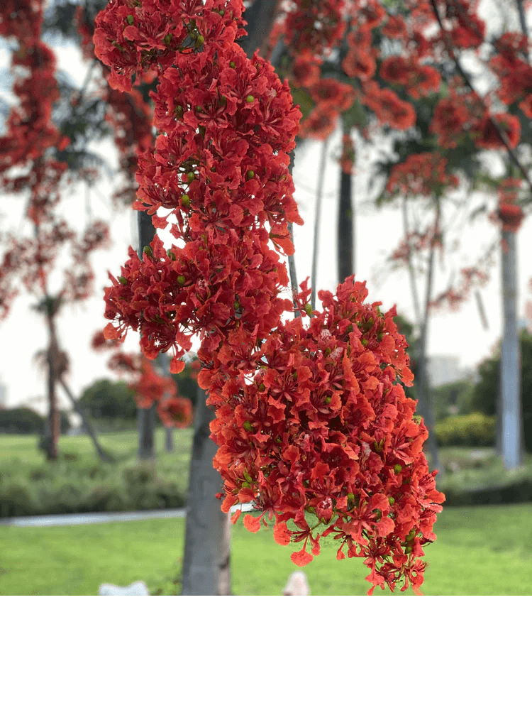 With its unique flowering habit and bright crimson blossoms, the royal Poinciana Tree is also known as Flamboyant or the red flame from mid-spring until late summer. The Royal Poinciana tree is a massive tree that is easily grown and maintained; it ultimately reaches 30 feet in height and 60 feet in width.