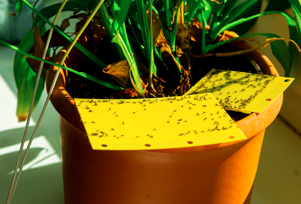 Sheets or strips of sticky paper hung around your plants will capture any insects that stop by. Yellow sticky trap for aphids placed next to indoor plant.