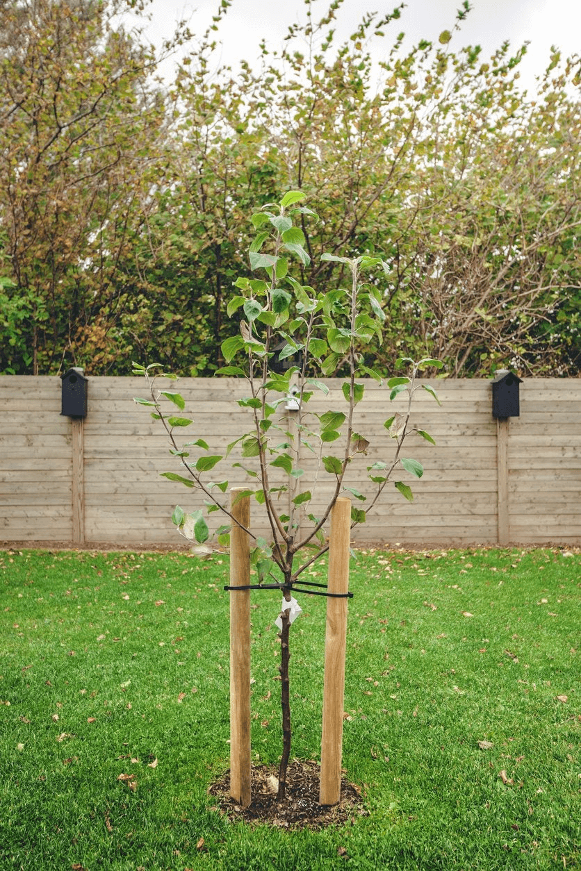 Staking is often unnecessary and can cause upper tree breakage. If the area is very windy, use two short stakes on opposite sides of the tree, but always stay outside the area of the roots. Wrap the trunk with a cloth or other material then tie sturdy ropes from the stake to the trunk allowing some movement. Remove stakes after one growing season. For more information read How to Repot a Plant?