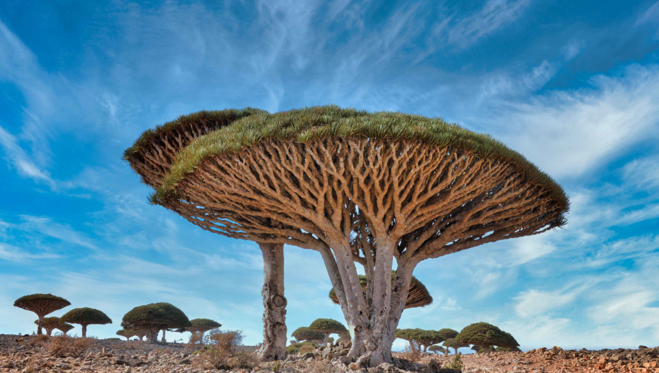 One of the dragon blood tree's most distinctive features is the red resin it secretes to close wounds and protect itself from insects and disease. It is derived by cutting slits in the bark, and it is used for a variety of purposes, from medicine and cosmetics to coloring agents.