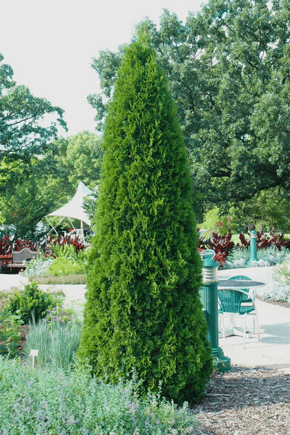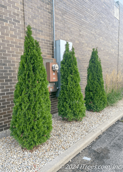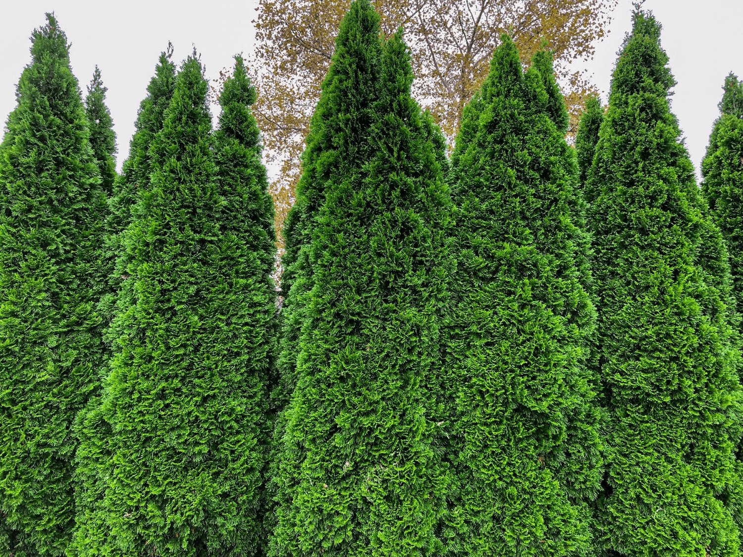 The Emerald Green or "Smaragd" arborvitae trees are narrow, pyramidal cultivars of the Thuja occidentalis tree. They grow about 10–15 feet in height by 3–4 feet in width. That makes them perfect for foundation planting, providing natural privacy screens in smaller yards and narrower spaces. They will grow up to 1–2 feet per year until fully grown and then grow 6–9 inches. Its dense green, scale-shaped leaves fan out in sprays. This thick foliage makes it ideal as a hedge or natural privacy screen around a garden or yard.
